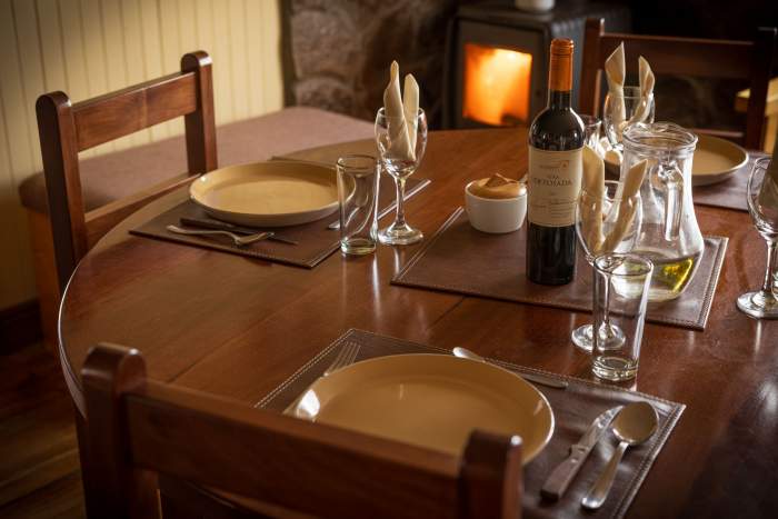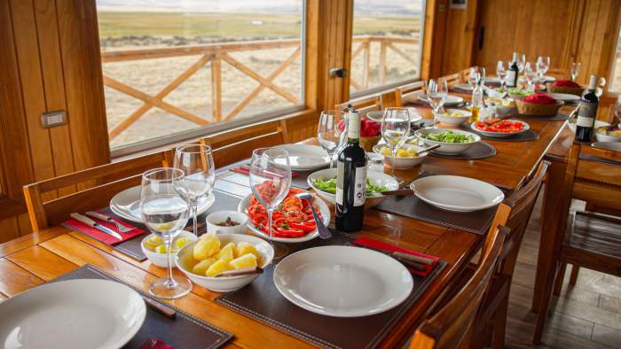 DINING: Guests will enjoy three chef-prepared meals each day as well as a selection of appetizers and hors d'oeuvres following daily fishing or other activities. Hearty breakfasts feature both Chilean and American staples such as breads, cereals, yogurts, eggs, meats, and fresh fruits. Lunches, typically served streamside, are hearty and filling — often including soups, stews, and sandwiches. Dinners feature pasture-raised Patagonian beef and lamb, local seafood, locally grown produce, and freshly baked breads. A curated selection of Chilean wines, hand-crafted cocktails, fine spirits, and local ales are also available at the lodge’s always-open bar.