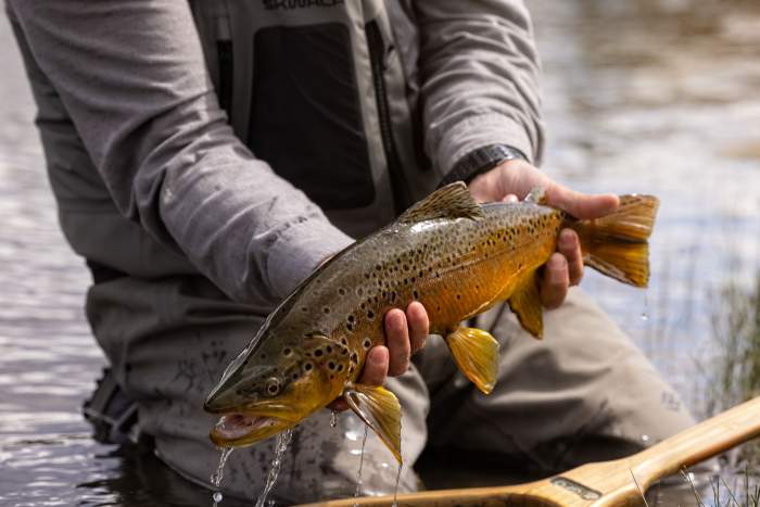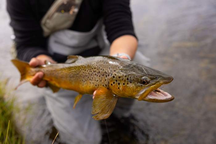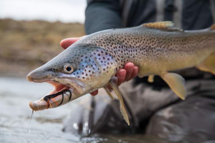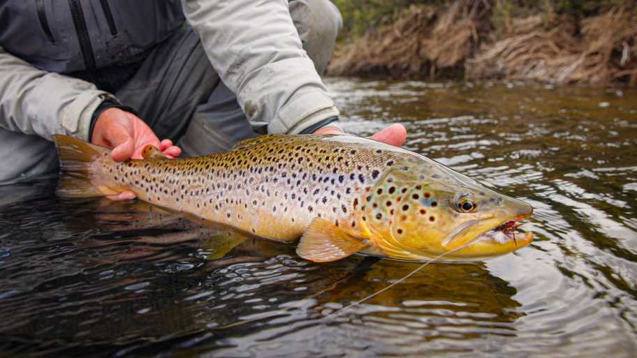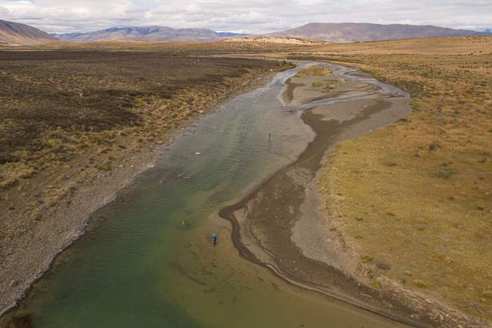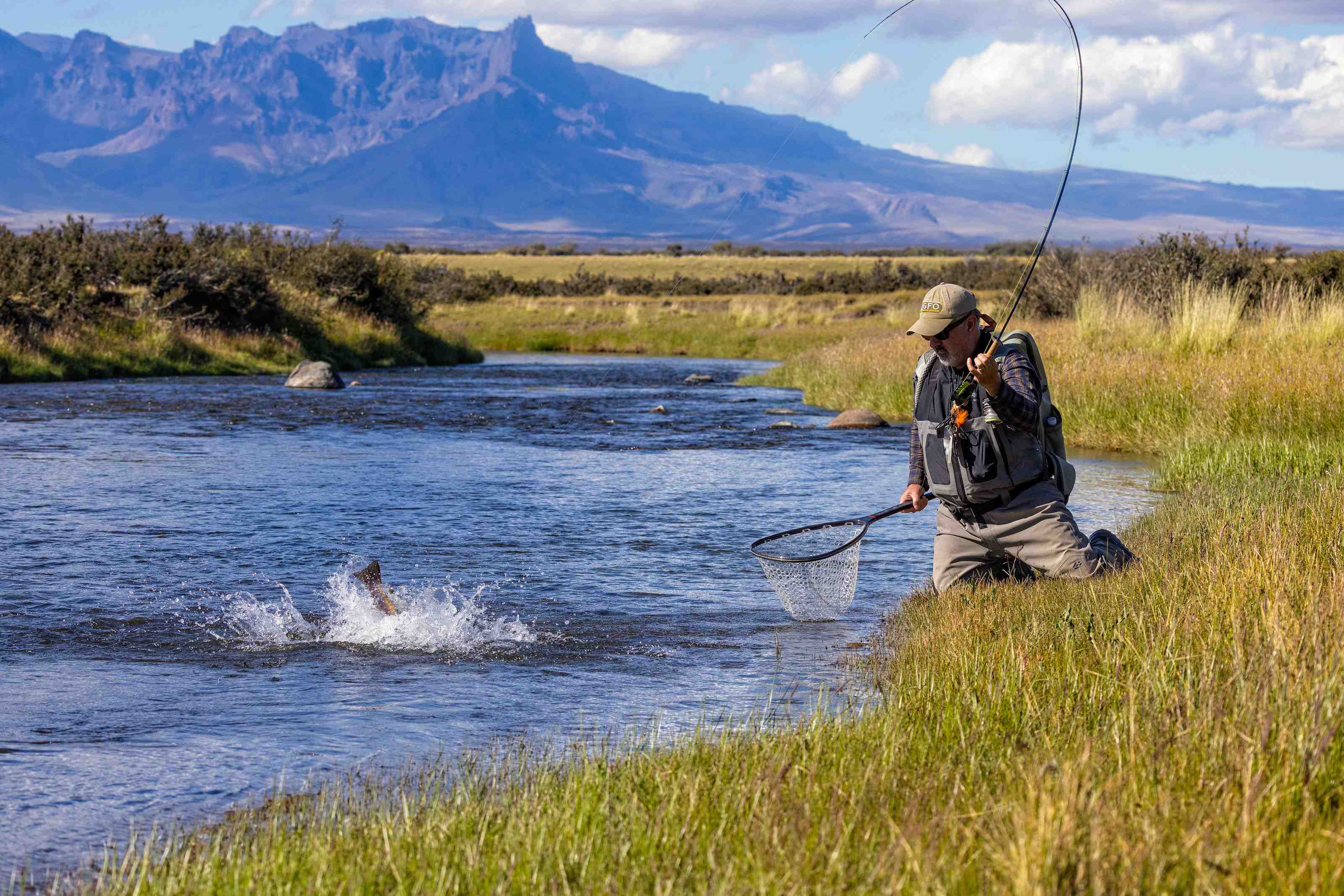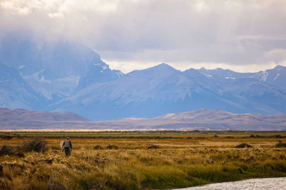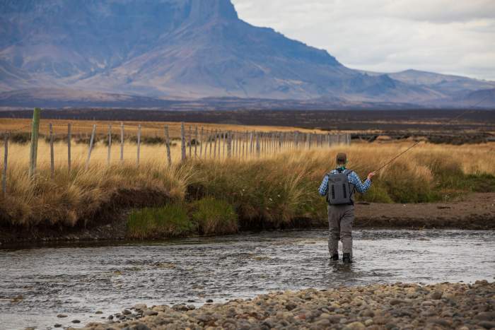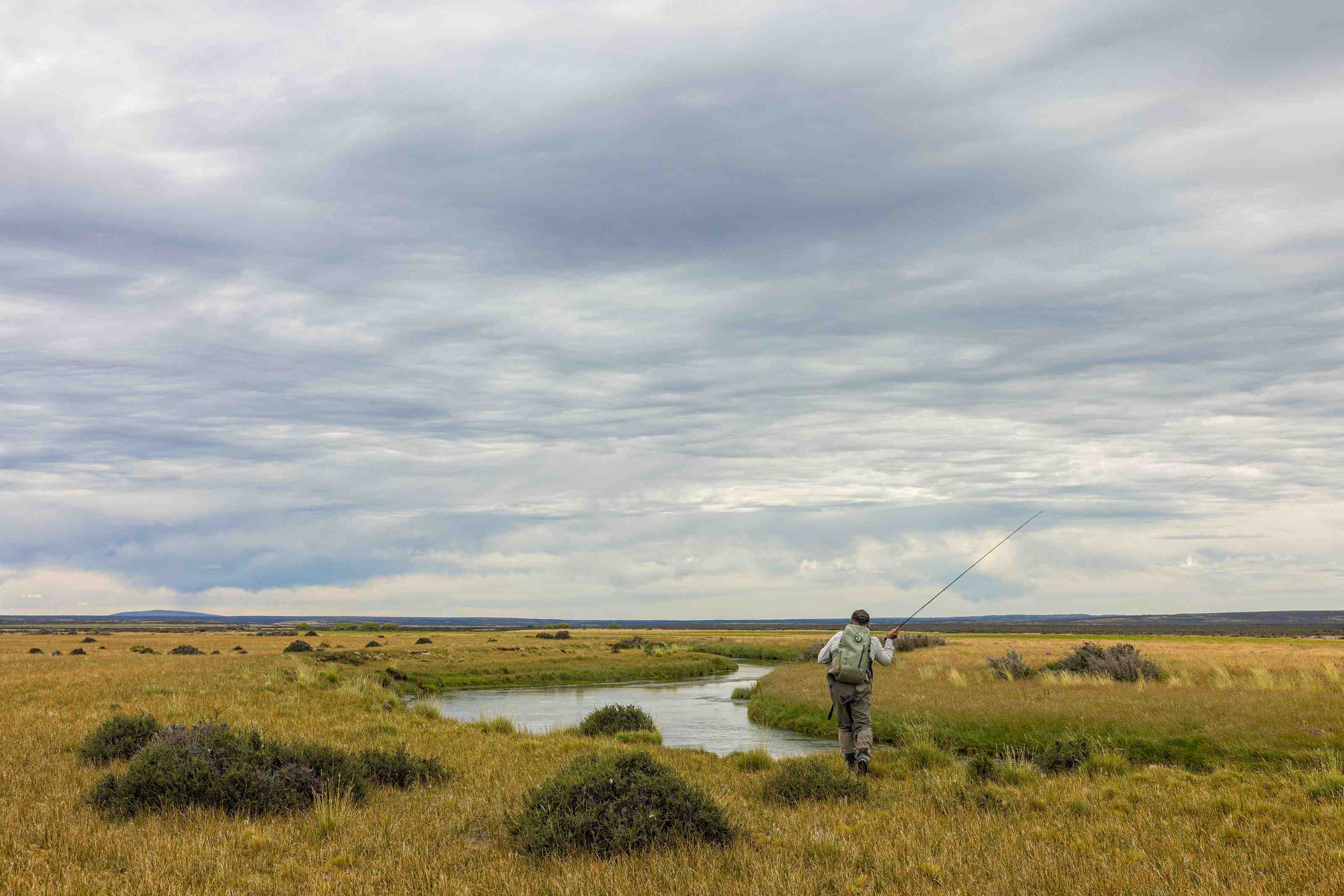 On the other side of the estancia, the river courses through the pampa, forming the border with the neighboring estancia. As it flows, it cuts steep banks through the pastureland — some as high as 20 feet tall. This is hopper-fishing territory, where the river’s brown trout are eager to move several feet to chase down a big meal. In autumn, the river is also home to large, migratory, silver-sided brown trout that run upriver from distant, downstream lakes.